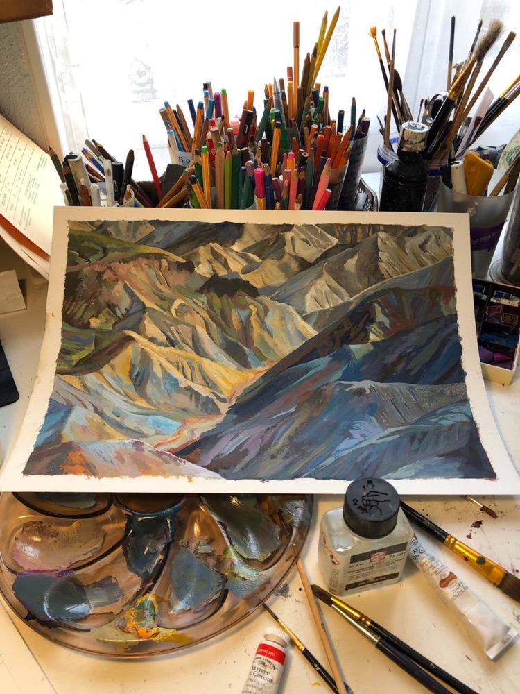 Gabrielle est de retour en France, entourĂ©e de piles de carnets, de feuilles, d’esquisses colorĂ©es. Elle trie, classe, sĂ©lectionne parmi les dizaines de peintures, dessins et croquis rĂ©alisĂ©s pendant le voyage. Tout ne pouvait pas naĂźtre sur place : entre la mĂ©tĂ©o capricieuse, la logistique lourde et la fatigue, il aurait Ă©tĂ© illusoire de tout rĂ©aliser au fil des jours. Mais ce n’est pas un Ă©chec — c’était Ă©crit dĂšs le dĂ©part.